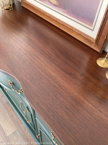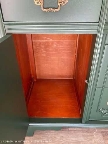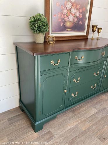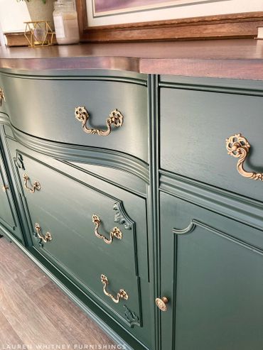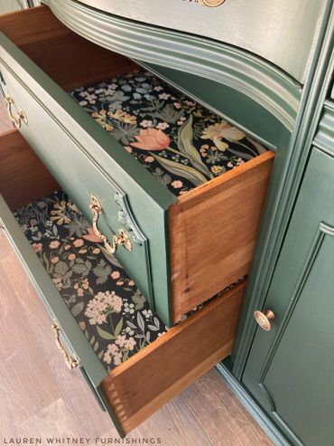 This mahogany sideboard is an absolute stunner! I’m totally in love with this forest green shade that is just so classy. The top was done in a dark, rich stain to compliment the green. Original hardware was given my custom antique brass finish. Inside cavities look great and the right side has an additional shelf inside. All drawers glide smoothly and are lined with a beautiful coordinating floral paper. The top right drawer has dividers.